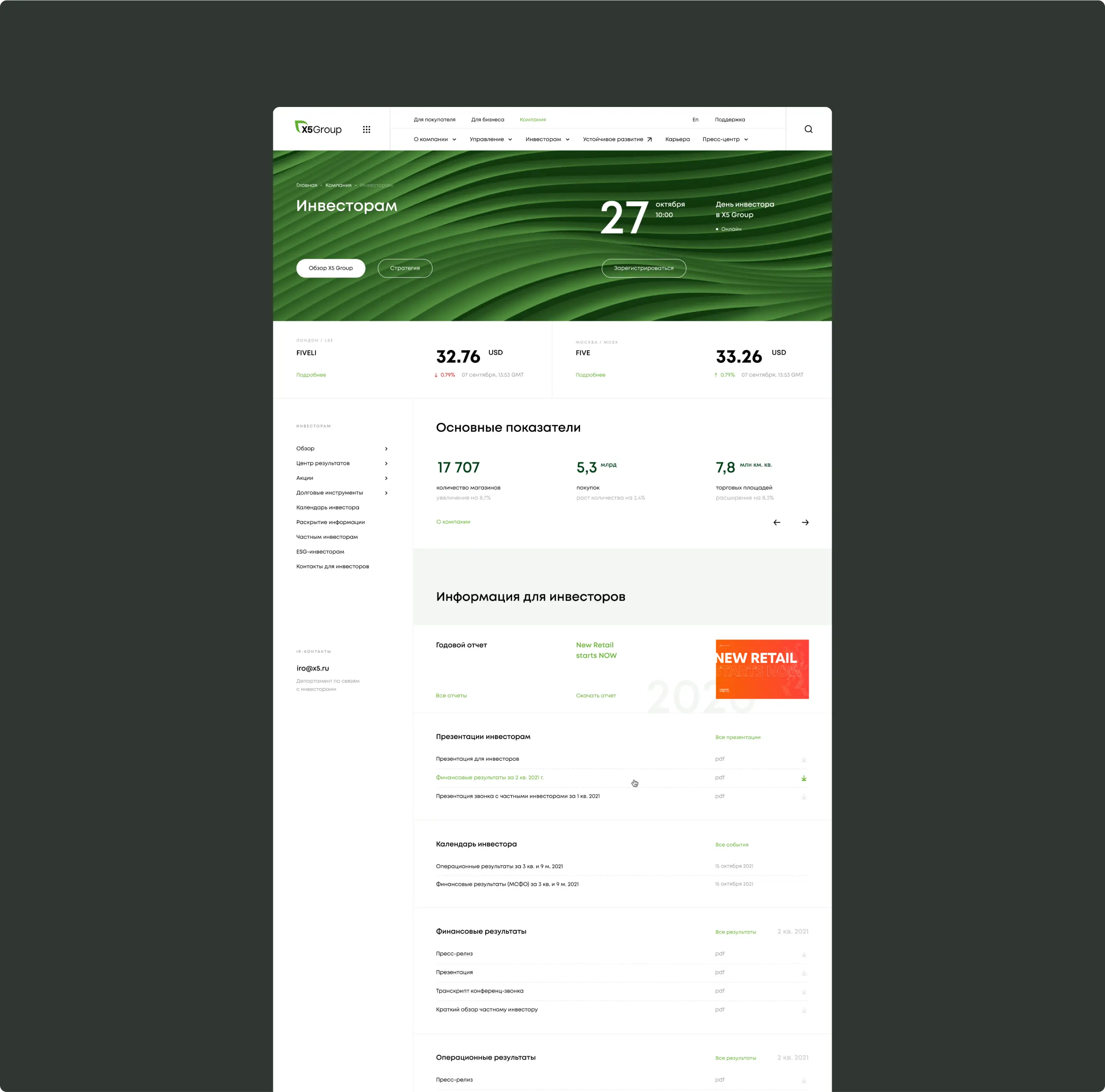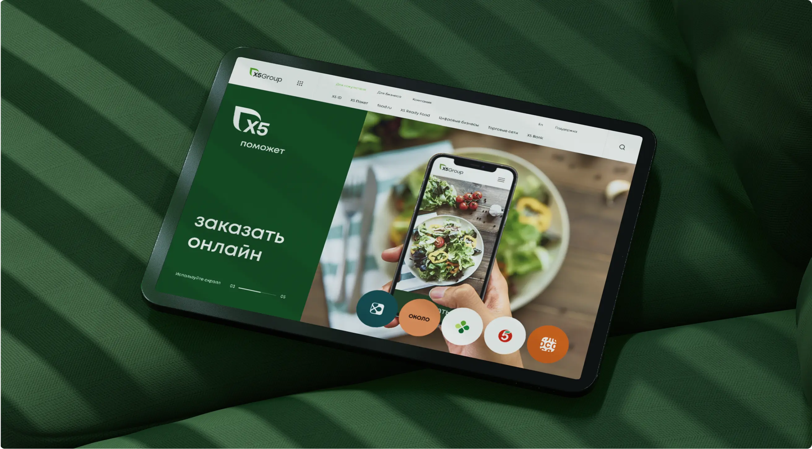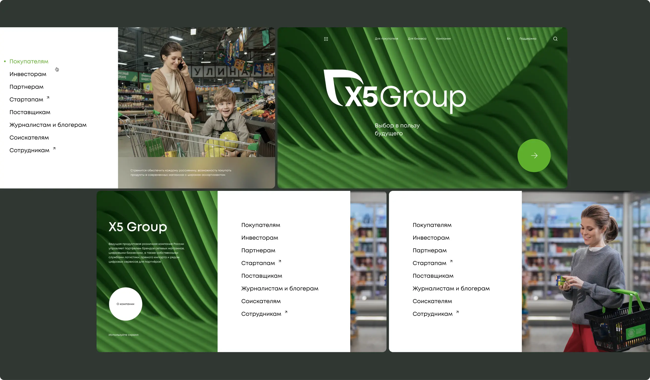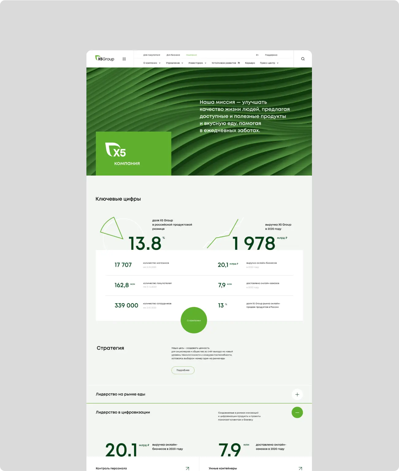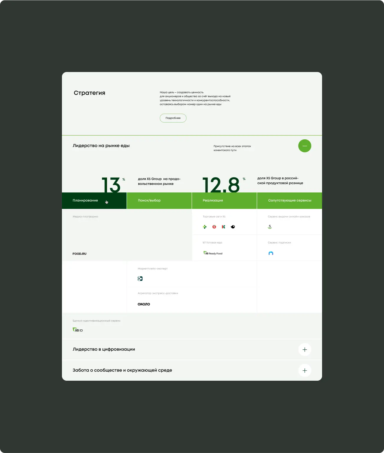 нужно отобразить на сайте новое видение: X5 — лидер в области продуктов питания, лидер в ключевых клиентских миссиях, связанных с едой, технологичная компания, присутствует на всех этапах клиентского пути, заботится о сообществе и окружающей среде