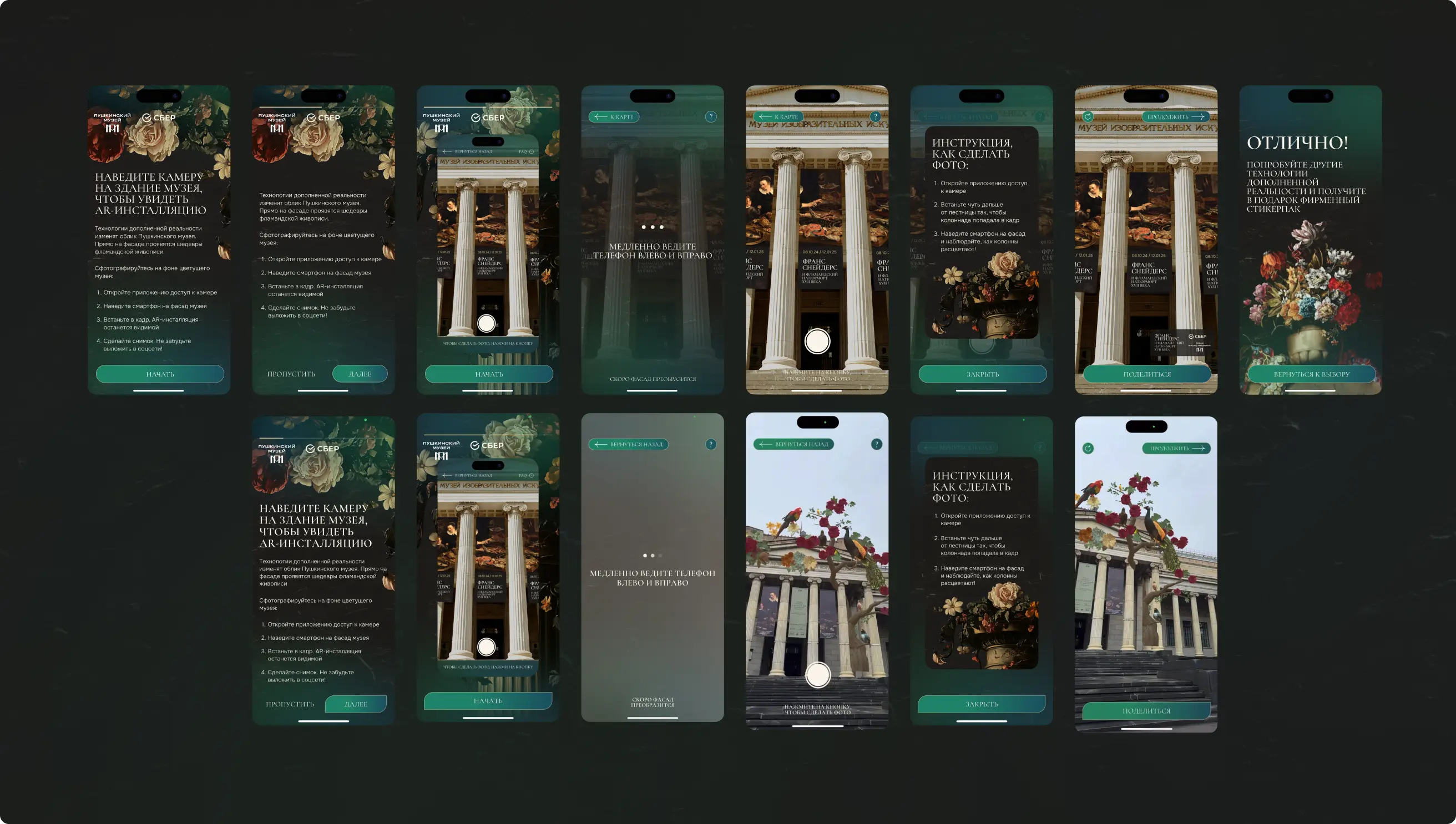 Ключевой визуальный элемент — AR-инсталляция на колоннаде центрального входа музея из цветущих растений. Через экран она оживала и задавала атмосферу выставки ещё со входа. Мы интегрировали её в сценарий посещения и оптимизировали под разные устройства.