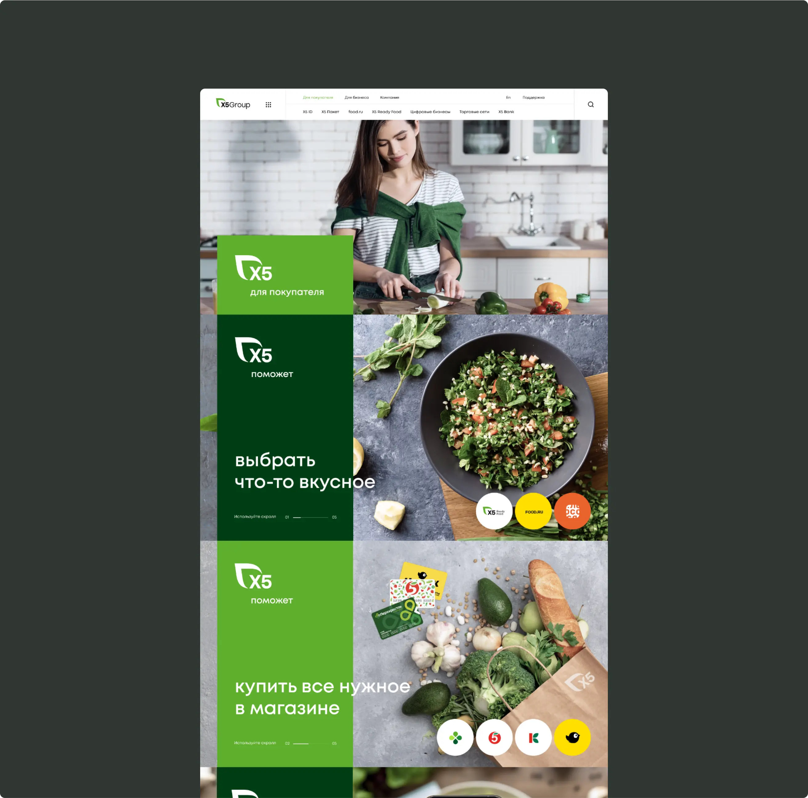 нужно отобразить на сайте новое видение: X5 — лидер в области продуктов питания, лидер в ключевых клиентских миссиях, связанных с едой, технологичная компания, присутствует на всех этапах клиентского пути, заботится о сообществе и окружающей среде